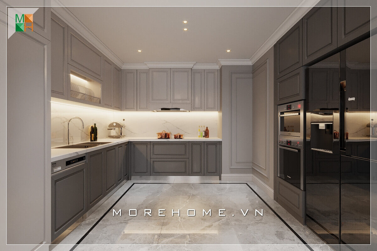 Mẫu thiết kế không gian bếp hiện đại nổi bật với gam màu xám ghi sang trọng cho biệt thự, nhà phố.