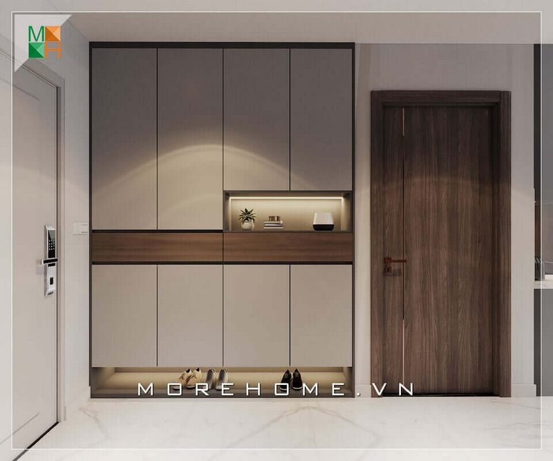Tủ đựng giầy thiết kế hiện đại từ gỗ acrylic trơn bóng kết hợp cùng chi tiết gỗ ốp ngang giúp mẫu tủ trở nên độc đáo hơn.
