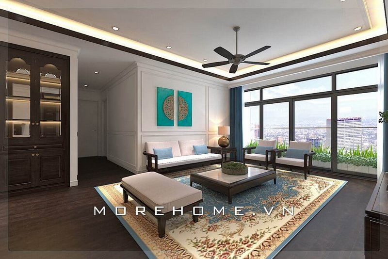 Nội thất gỗ tự nhiên cao cấp của mẫu thiết kế phòng khách chung cư cao cấp giúp tạo nên cảm giác ấm áp và cuốn hút mọi ánh nhìn.